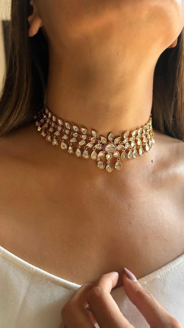 Dripping in elegance, this handcrafted Kundan gold choker blends tradition with timeless beauty. Adorned with teardrop-shaped stones and intricate detailing, it radiates regal charm, making it the perfect statement piece for weddings, festive occasions, or grand celebrations. Its lightweight yet luxurious design ensures both comfort and sophistication, turning every glance into admiration.